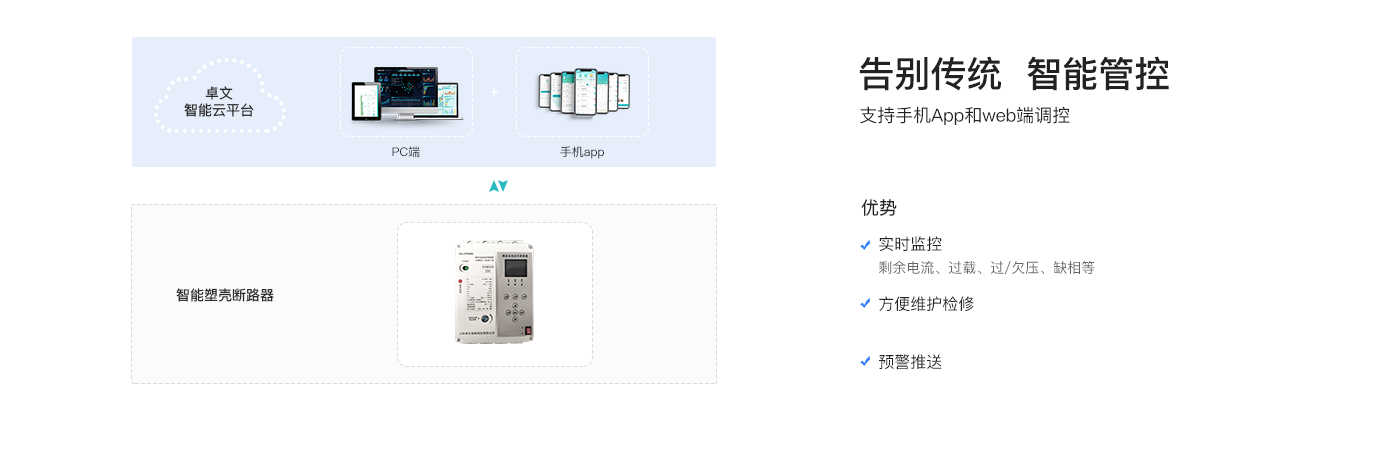 智慧塑壳断路器使用电管理更加智能化可以实时采集数据(如电压、电流、漏电流、有功功率、无功功率、功率因数、温度、电量等各种用电信息)。